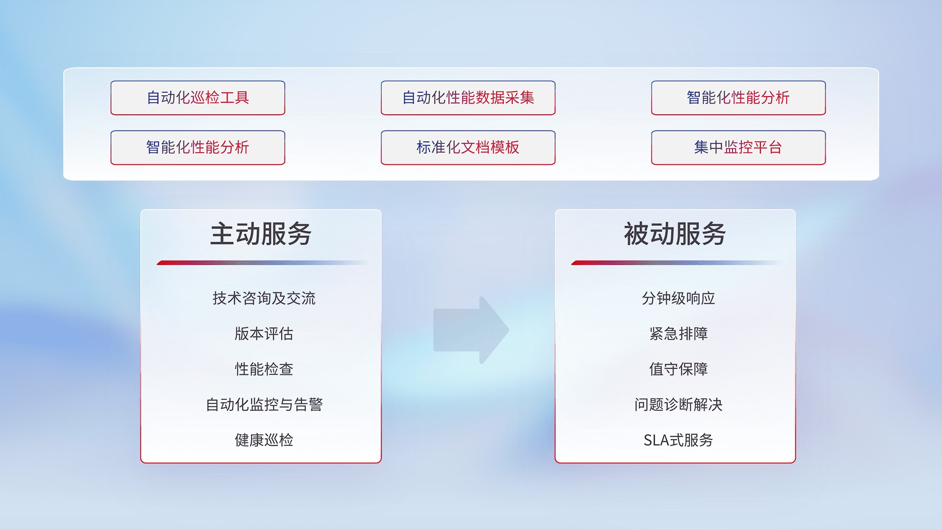 智能化工具和标准化文档,,保障服务质量,,,提供主动服务(包含技术咨询、、版本评估、、、性能检查、、、、自动化监控与告警、、健康巡检)和被动服务包含(分钟级响应、、紧急排障、、值守保障、、、、问题诊断解决、、、SLA服务)。。。。